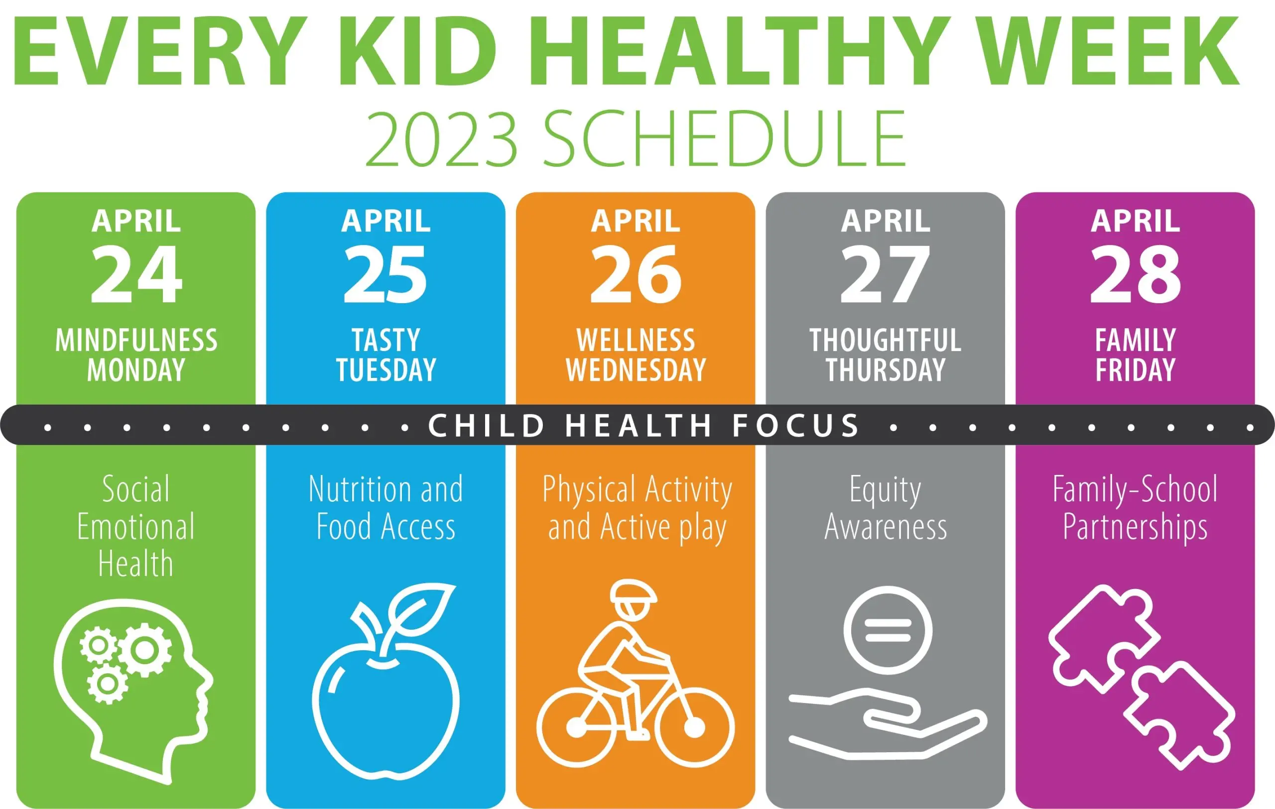 Every Kid Healthy™ Week is observed the last full week of April each year. Each day of the week shines a spotlight on actions families can take to improve the health and wellness of their kids and the link between nutrition, physical activity, mental health, and learning – because healthy kids are better prepared to learn and thrive!